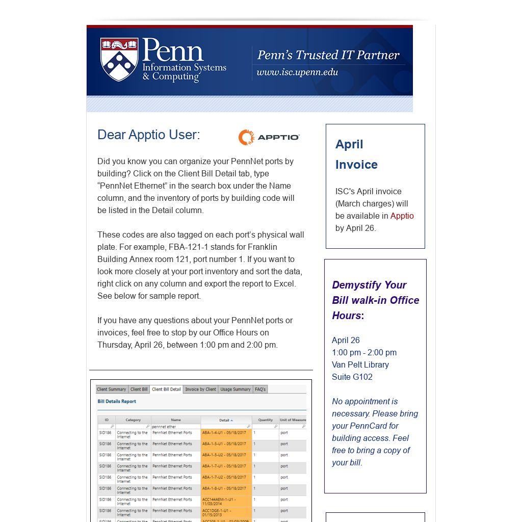 Did you know you can organize your PennNet ports by building? Click on the Client Bill Detail tab, type “PennNet Ethernet” in the search box under the Name column, and the inventory of ports by building code will be listed in the Detail column.