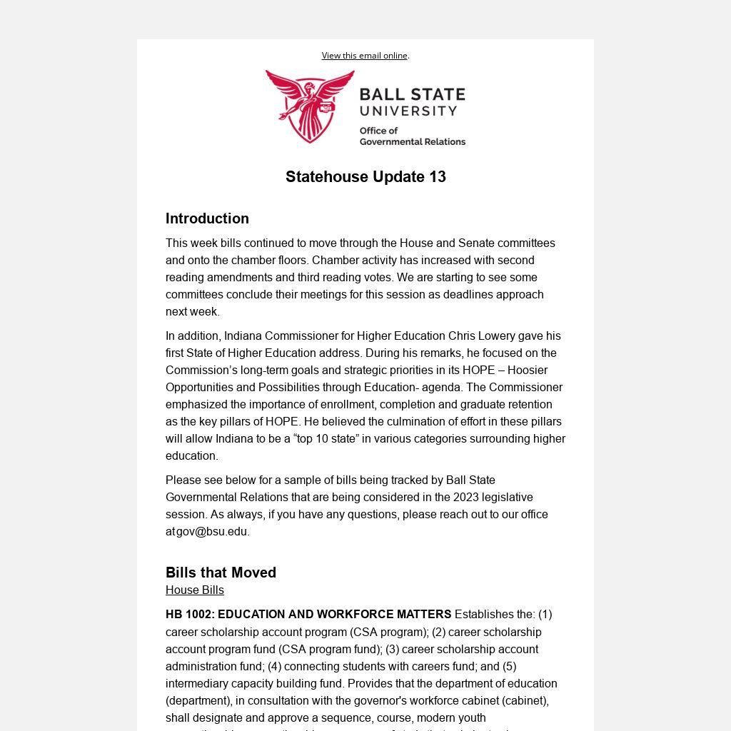 Please see below for a sample of bills being tracked by Ball State Governmental Relations that are being considered in the 2023 legislative session. As always, if you have any questions, please reach out to our office at gov@bsu.edu.