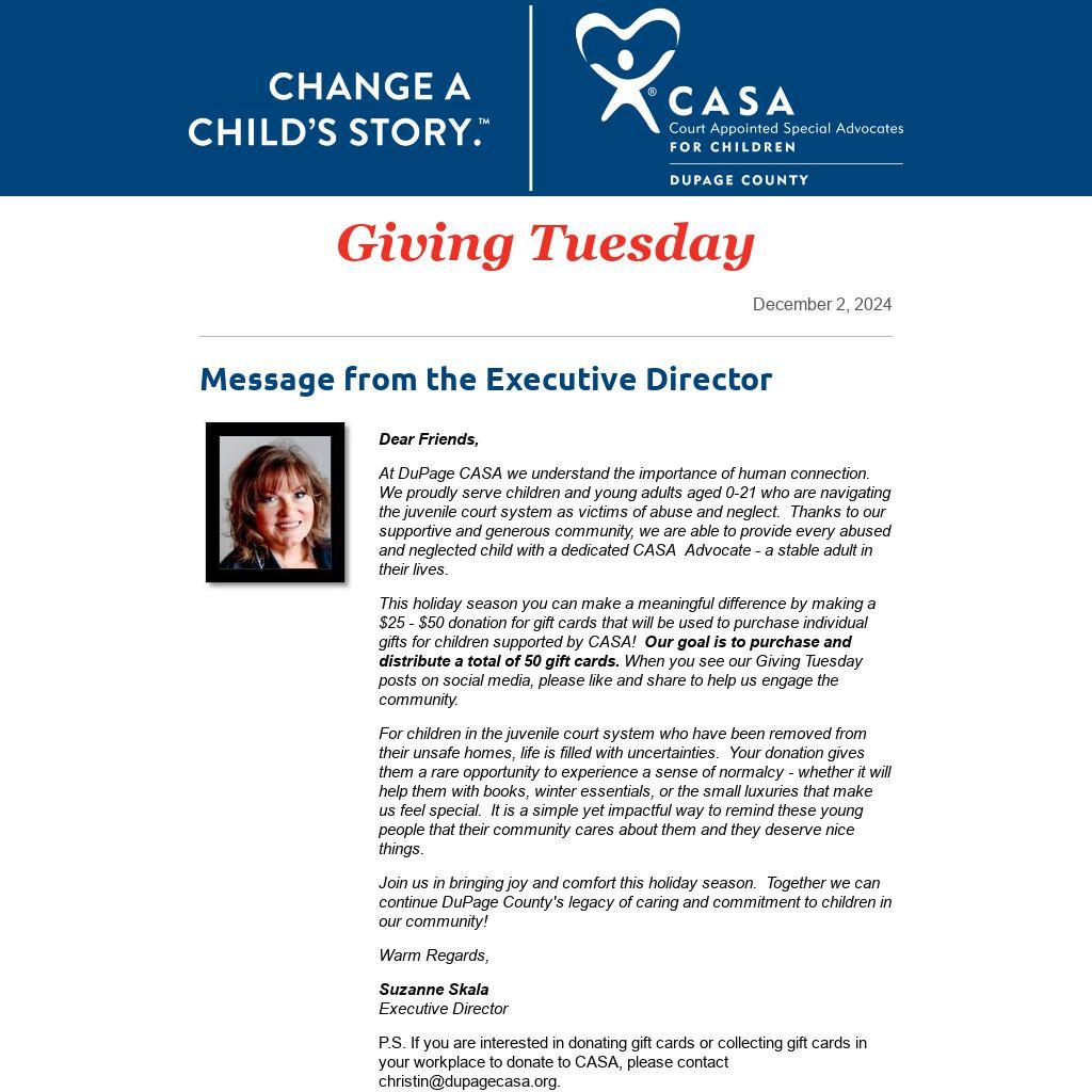 This holiday season you can make a meaningful difference by making a $25 - $50 donation for gift cards that will be used to purchase individual gifts for children supported by CASA! Our goal is to purchase and distribute a total of 50 gift cards. When you see our Giving Tuesday posts on social media, please like and share to help us engage the community.