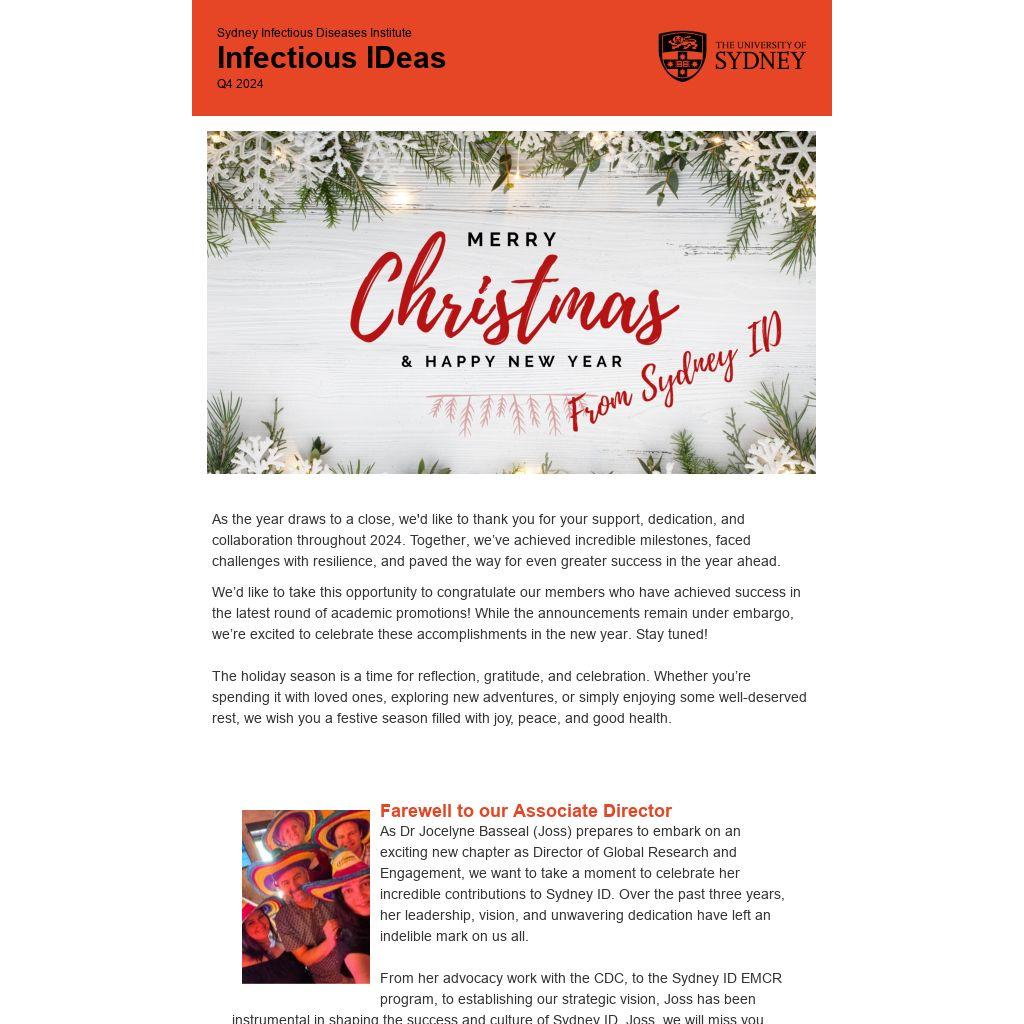 Farewell to our Associate DirectorAs Dr Jocelyne Basseal (Joss) prepares to embark on an exciting new chapter as Director of Global Research and Engagement, we want to take a moment to celebrate her incredible contributions to Sydney ID. Over the past three years, her leadership, vision, and unwavering dedication have left an indelible mark on us all.