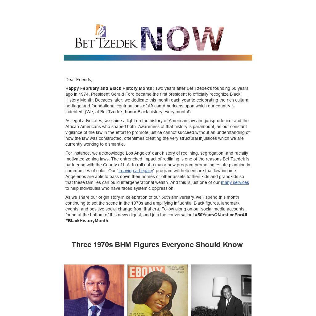 Happy February and Black History Month! Two years after Bet Tzedek’s founding 50 years ago in 1974, President Gerald Ford became the first president to officially recognize Black History Month. Decades later, we dedicate this month each year to celebrating the rich cultural heritage and foundational contributions of African Americans upon which our country is indebted. (We, at Bet Tzedek, honor Black history every month!)