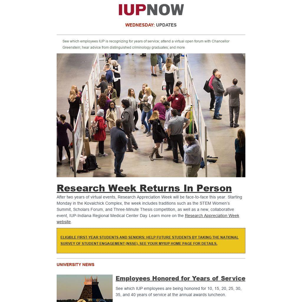 Distributed to IUP employees and students three days a week, IUP Now is the official newsletter of Indiana University of Pennsylvania. It features news from across the IUP website, compiled by the Division of Marketing and Communications. Find out how to get your news and events in IUP Now.