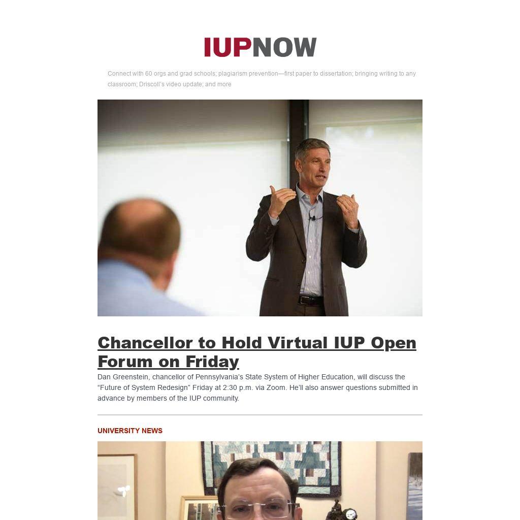 IUP Now is distributed to employees and students four days a week (weekdays other than Tuesday). It is the official newsletter of Indiana University of Pennsylvania, featuring news that the Division of Marketing and Communications compiles from the IUP website. Find out how to get your news and events in IUP Now.