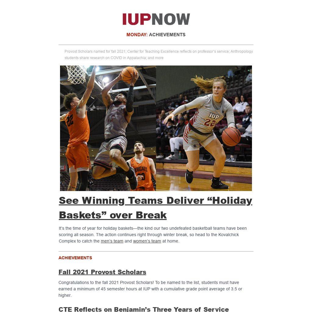 Distributed to IUP employees and students three days a week, IUP Now is the official newsletter of Indiana University of Pennsylvania. It features news from across the IUP website, compiled by the Division of Marketing and Communications. Find out how to get your news and events in IUP Now.