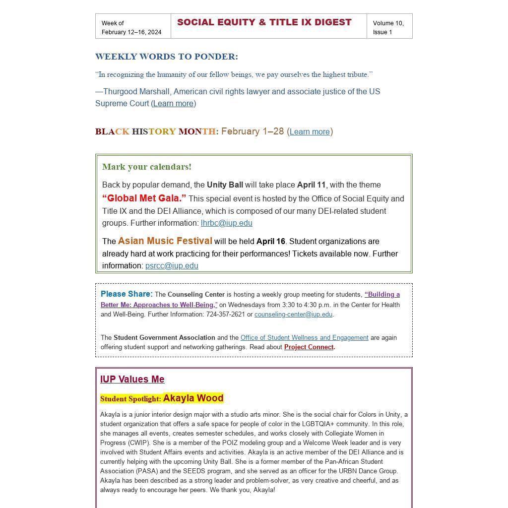 Digest issues are emailed every Monday morning. Send all information concerning your event to social-equity@iup.edu, and we will include it in the appropriate weekly issue. And, please be sure to enter your event in the CMS through the DIVERSITY, STUDENT, and CENTRAL CALENDARS so that it will receive wider marketing and achieve greater attendance.