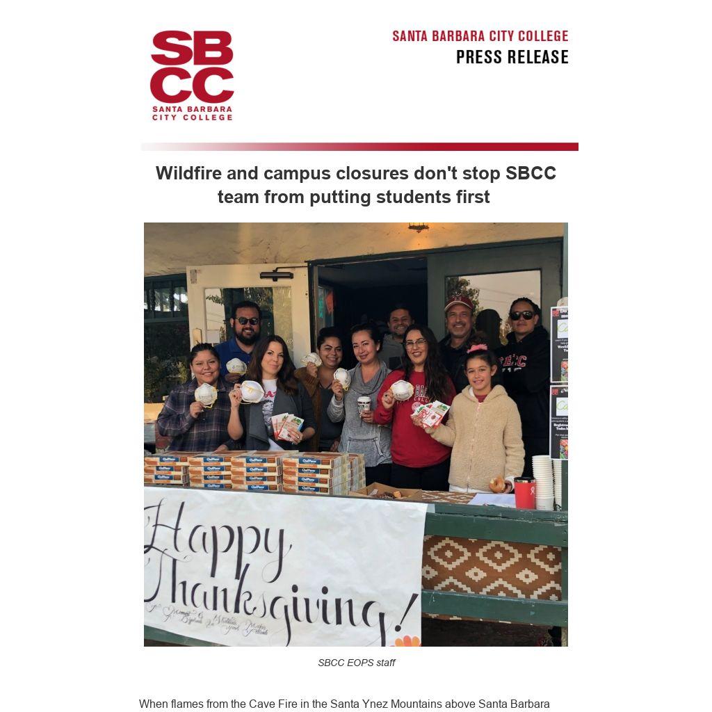 When flames from the Cave Fire in the Santa Ynez Mountains above Santa Barbara erupted on Monday, Nov. 25, evacuation notices, fluctuating power and poor air quality prompted the closing of all three Santa Barbara City College campuses on the days before Thanksgiving. That didn't stop the staff and counselors of SBCC's Extended Opportunity Programs and Services (EOPS) from serving their students, however.