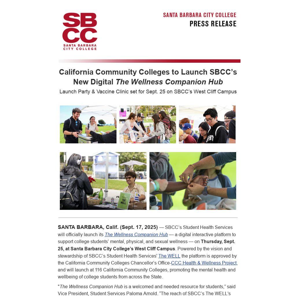 SANTA BARBARA, Calif. (Sept. 17, 2025) — SBCC’s Student Health Services will officially launch its The Wellness Companion Hub — a digital interactive platform to support college students’ mental, physical, and sexual wellness — on Thursday, Sept. 25, at Santa Barbara City College’s West Cliff Campus. Powered by the vision and stewardship of SBCC’s Student Health Services' The WELL the platform is approved by the California Community Colleges Chancellor’s Office-CCC Health & Wellness Project, and will launch at 116 California Community Colleges, promoting the mental health and wellbeing of college students from across the State.