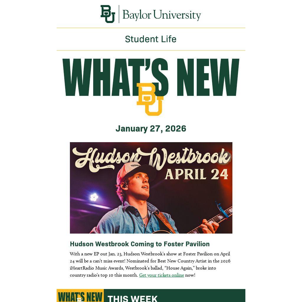 If you are a department or Baylor student organization and have items you would like to see appear in What's New BU, submit them for consideration by Friday at 8 a.m. by clicking here or emailing them to whatsnew@baylor.edu. View past issues of What’s New BU here.