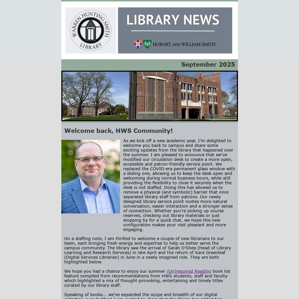 As we kick off a new academic year, I’m delighted to welcome you back to campus and share some exciting updates from the library that happened over the summer. I am pleased to announce that we’ve modified our circulation desk to create a more open, accessible and patron-friendly service point. We replaced the COVID-era permanent glass window with a sliding one, allowing us to keep the desk open and welcoming during normal business hours, while still providing the flexibility to close it securely when the desk is not staffed. Doing this has allowed us to remove a physical (and symbolic) barrier that once separated library staff from patrons. Our newly designed library service point invites more natural conversation, easier interaction and a stronger sense of connection. Whether you're picking up course reserves, checking out library materials or just stopping by for a quick chat, we hope this new configuration makes your visit pleasant and more engaging.