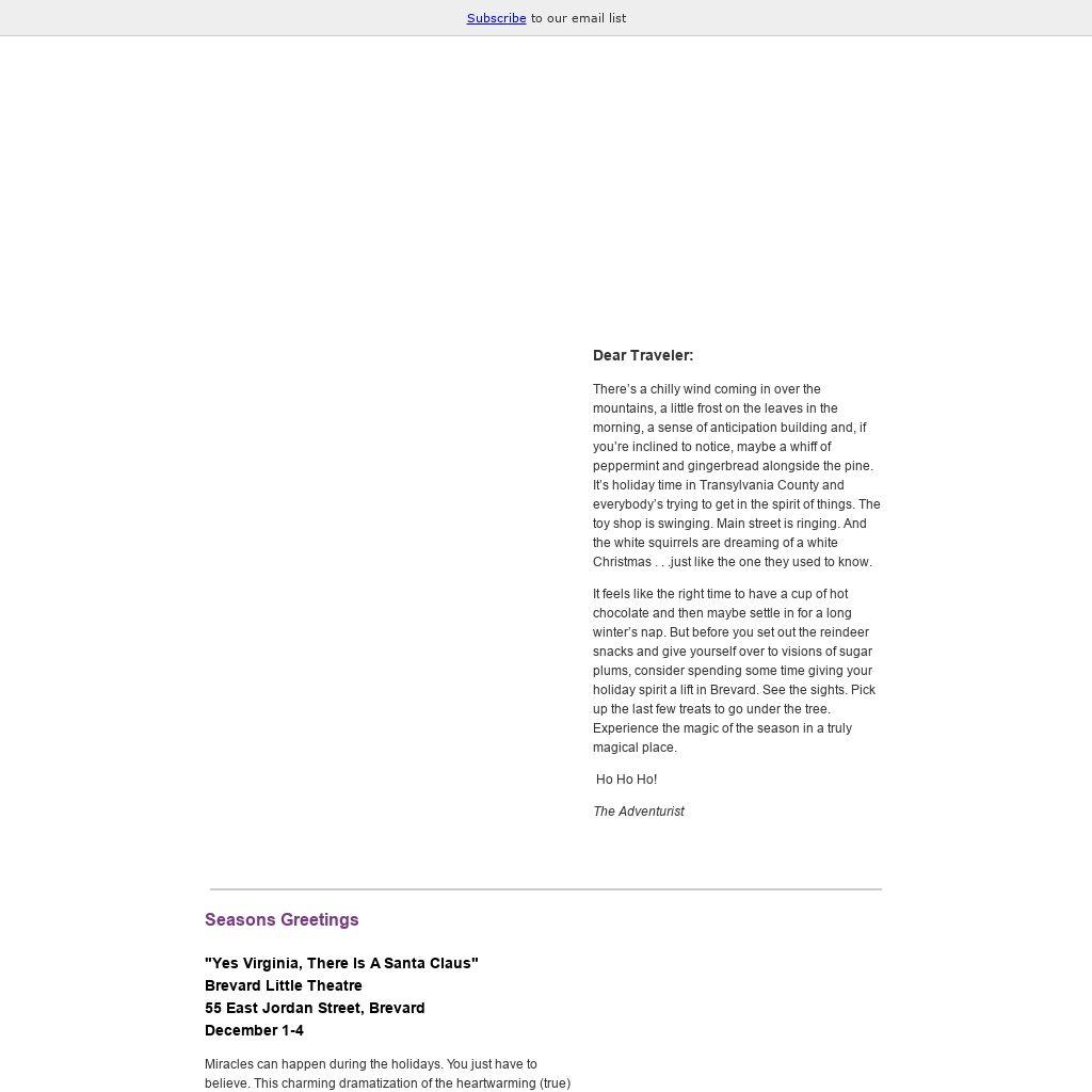 Dear Traveler: There’s a chilly wind coming in over the mountains, a little frost on the leaves in the morning, a sense of anticipation building and, if you’re inclined to notice, maybe a whiff of peppermint and gingerbread alongside the pine. It’s holiday time in Transylvania County and everybody’s trying to get in the spirit of things. The toy shop is swinging. Main street is ringing. And the white squirrels are dreaming of a white Christmas . . .just like the one they used to know. It feels like the right time to have a cup of hot chocolate and then maybe settle in for a long winter’s nap. But before you set out the reindeer snacks and give yourself over to visions of sugar plums, consider spending some time giving your holiday spirit a lift in Brevard. See the sights. Pick up the last few treats to go under the tree. Experience the magic of the season in a truly magical place. Ho Ho Ho! The Adventurist