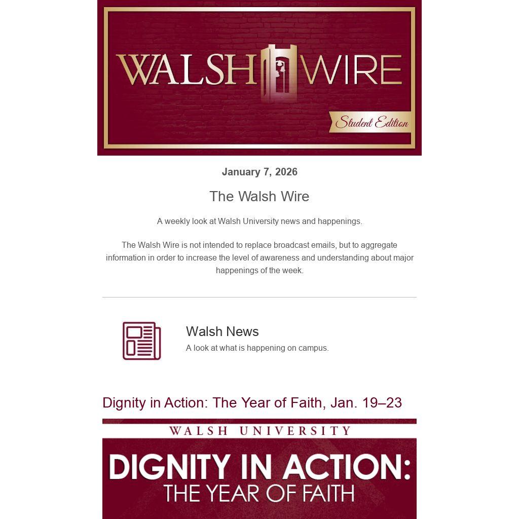 Students are invited to participate in the 2026 Dr. Martin Luther King Jr. Essay Contest, which reflects this year’s theme, The Year of Faith. Inspired by Dr. King’s example of faith in action, students are encouraged to reflect on how their faith convictions guide their actions, service, and leadership at Walsh and beyond. Detailed submission instructions were shared via email from the Office for Culture and Belonging on Monday, January 5. Submissions are due by Wednesday, Jan. 14, at 5 p.m., and winners will be recognized at the MLK Jr. Day of Service Breakfast. The winning essay will be awarded a non-renewable $1,000 scholarship. Second and third-place winners will be awarded a non-renewable $500 scholarship. | Submit Essay Here