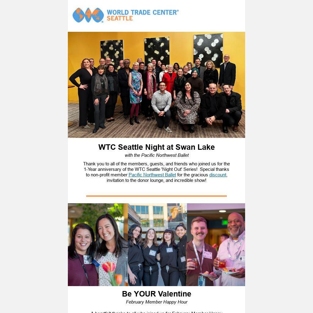 Thank you to all of the members, guests, and friends who joined us for the 1-Year anniversary of the WTC Seattle 'Night Out' Series! Special thanks to non-profit member Pacific Northwest Ballet for the gracious discount, invitation to the donor lounge, and incredible show!