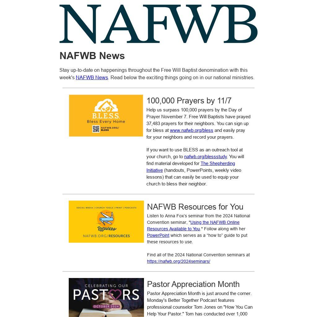 100,000 Prayers by 11/7Help us surpass 100,000 prayers by the Day of Prayer November 7. Free Will Baptists have prayed 37,483 prayers for their neighbors. You can sign up for bless at www.nafwb.org/bless and easily pray for your neighbors and record your prayers.