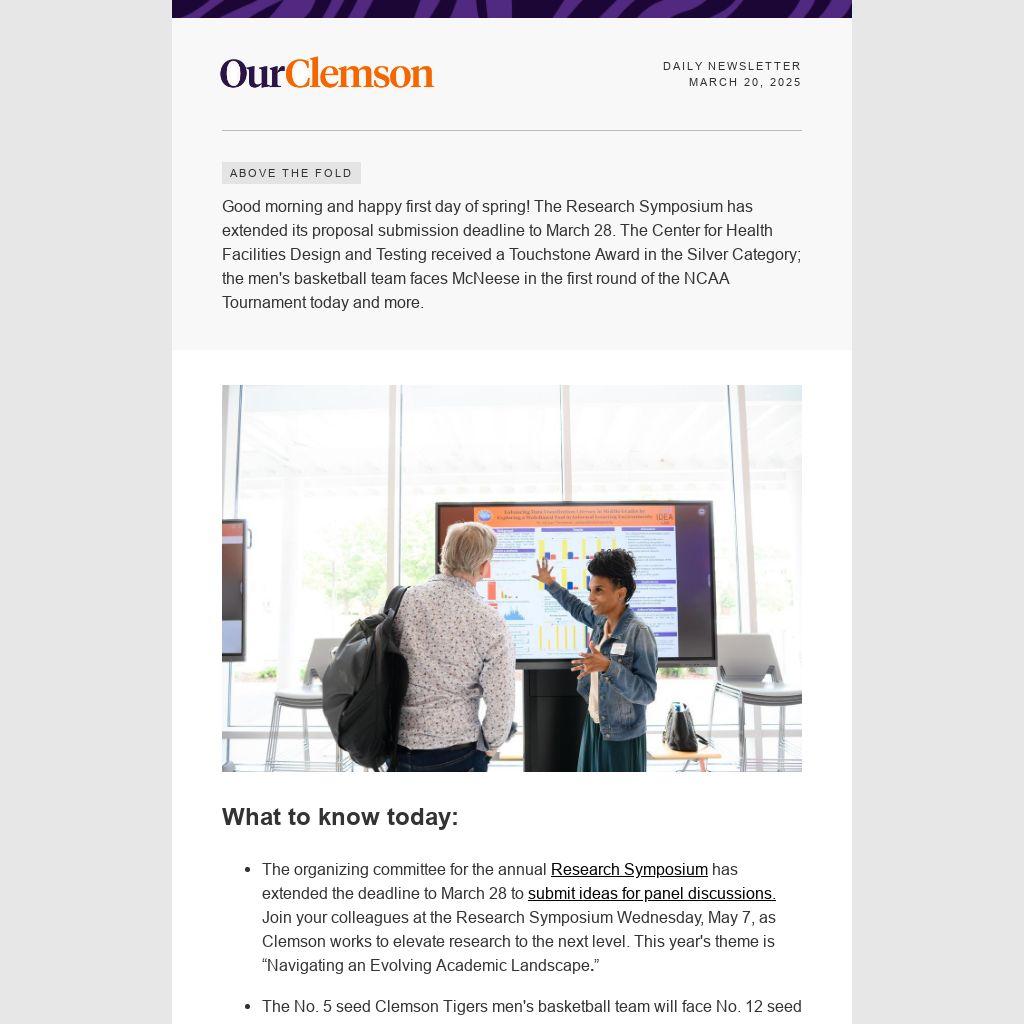 Good morning and happy first day of spring! The Research Symposium has extended its proposal submission deadline to March 28. The Center for Health Facilities Design and Testing received a Touchstone Award in the Silver Category; the men's basketball team faces McNeese in the first round of the NCAA Tournament today and more.