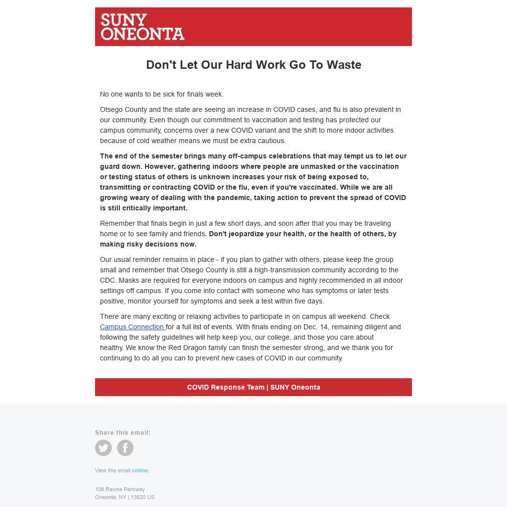 Our usual reminder remains in place - if you plan to gather with others, please keep the group small and remember that Otsego County is still a high-transmission community according to the CDC. Masks are required for everyone indoors on campus and highly recommended in all indoor settings off campus. If you come into contact with someone who has symptoms or later tests positive, monitor yourself for symptoms and seek a test within five days.