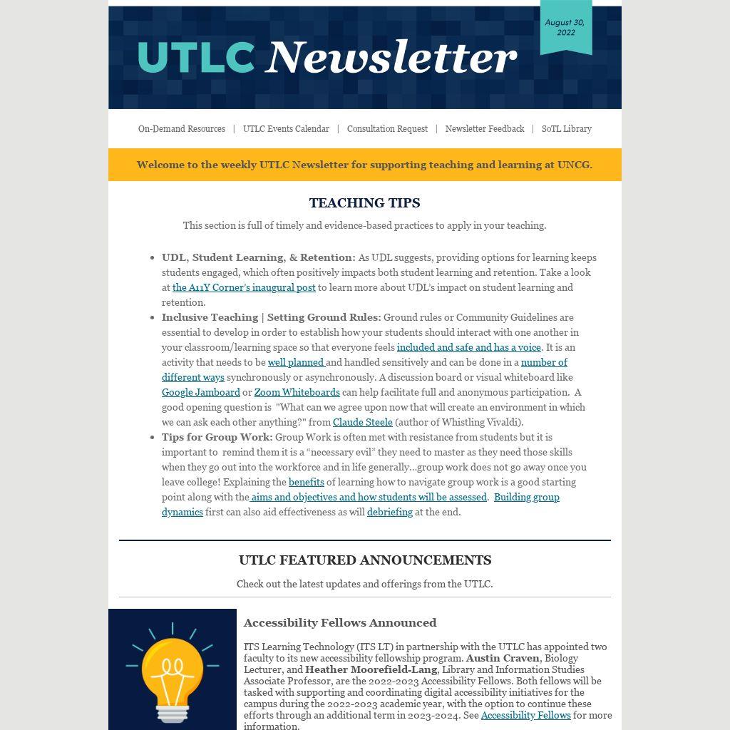 Welcome to the weekly UTLC Newsletter for supporting teaching and learning at UNCG.