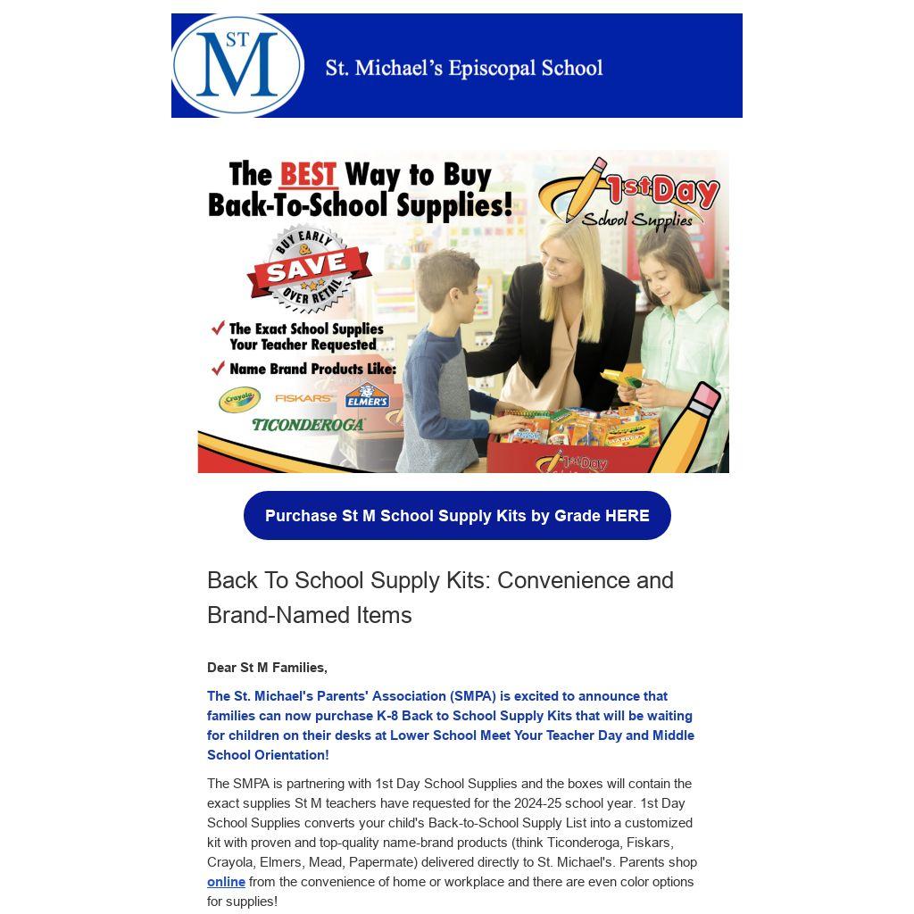 The SMPA is partnering with 1st Day School Supplies and the boxes will contain the exact supplies St M teachers have requested for the 2024-25 school year. 1st Day School Supplies converts your child's Back-to-School Supply List into a customized kit with proven and top-quality name-brand products (think Ticonderoga, Fiskars, Crayola, Elmers, Mead, Papermate) delivered directly to St. Michael's. Parents shop online from the convenience of home or workplace and there are even color options for supplies!