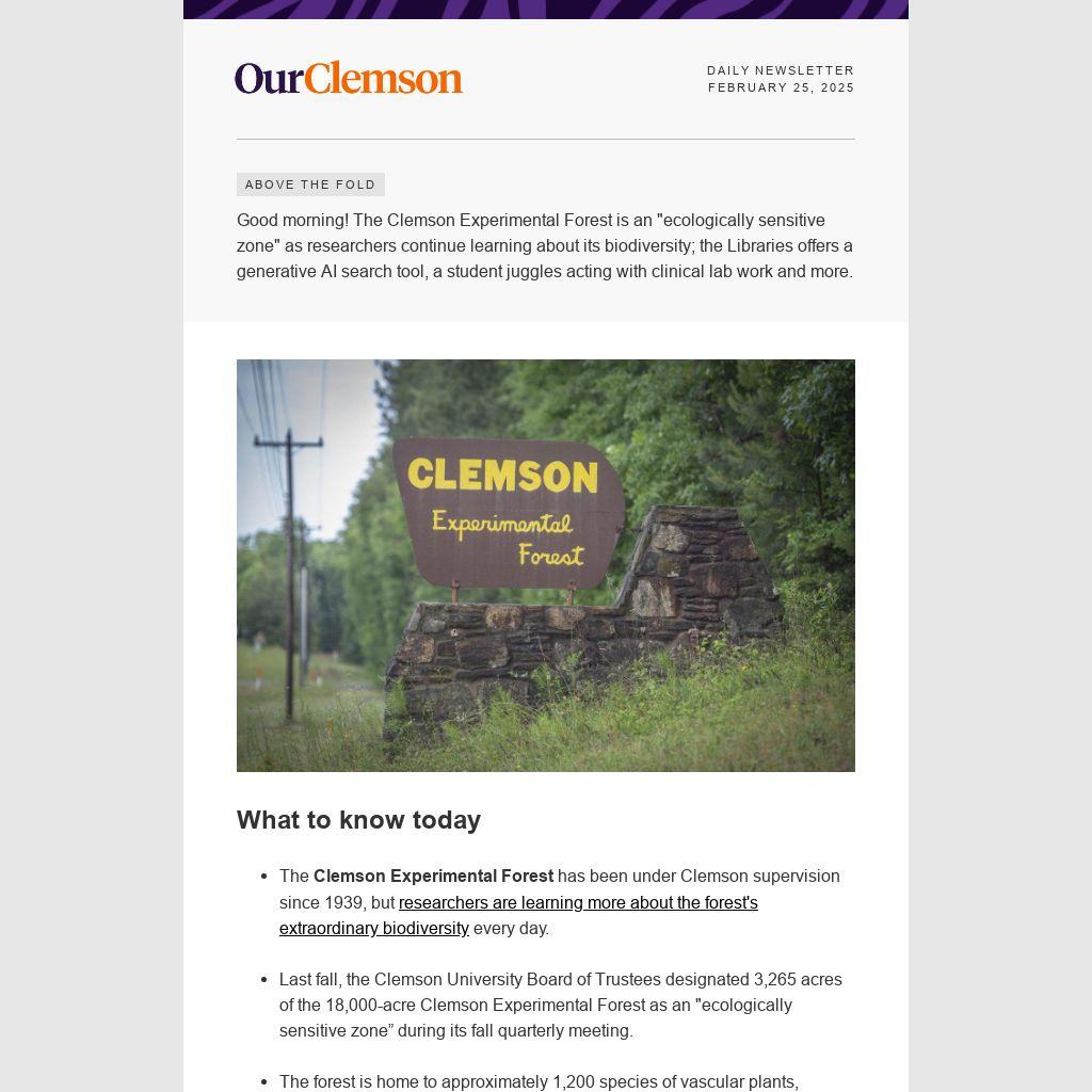 Good morning! The Clemson Experimental Forest is an "ecologically sensitive zone" as researchers continue learning about its biodiversity; the Libraries offers a generative AI search tool, a student juggles acting with clinical lab work and more.