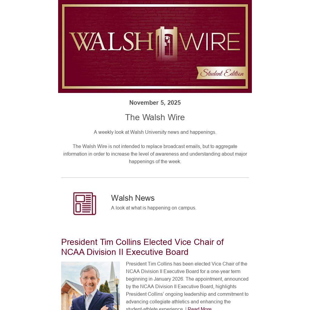 The Walsh Wire is not intended to replace broadcast emails, but to aggregate information in order to increase the level of awareness and understanding about major happenings of the week.