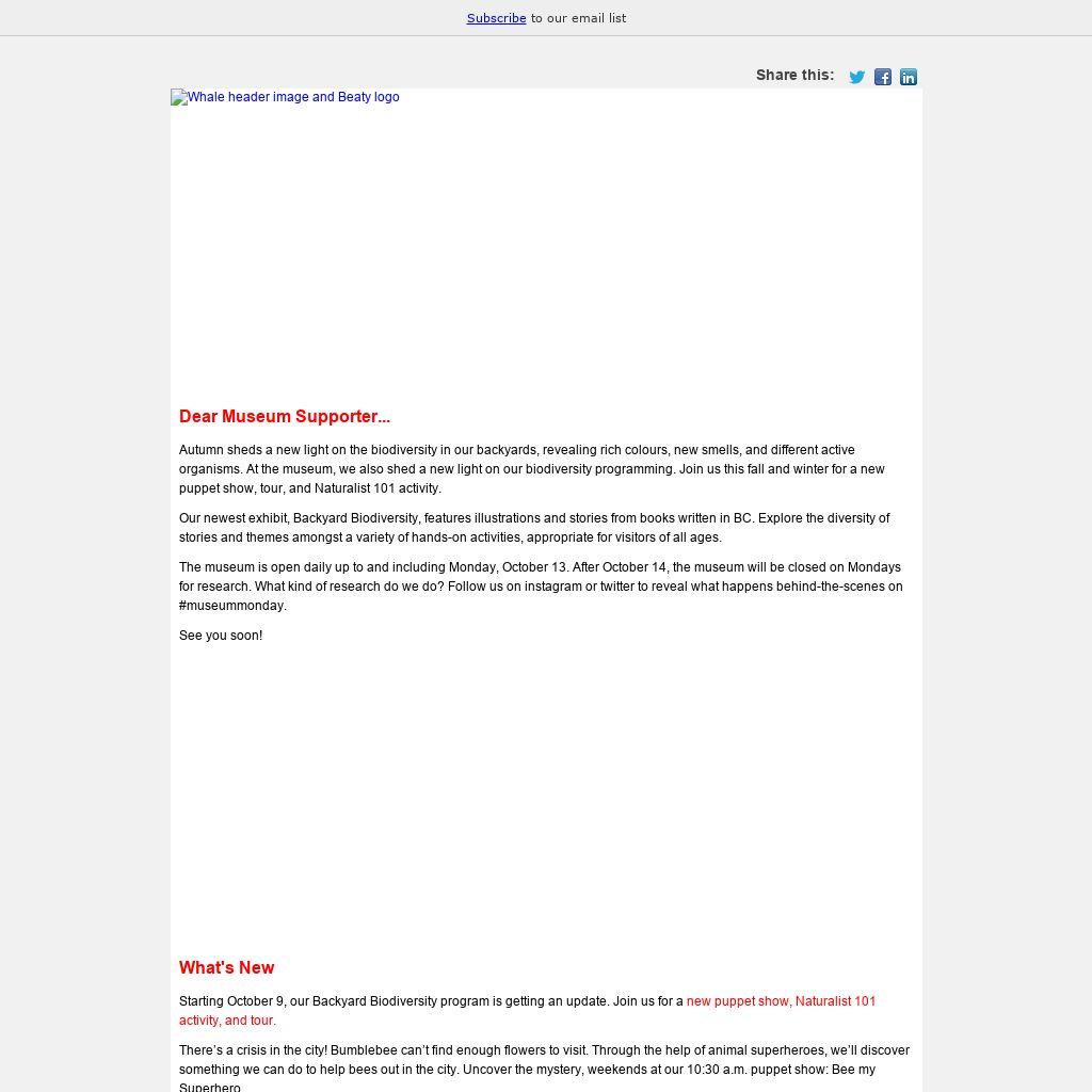 Autumn sheds a new light on the biodiversity in our backyards, revealing rich colours, new smells, and different active organisms. At the museum, we also shed a new light on our biodiversity programming. Join us this fall and winter for a new puppet show, tour, and Naturalist 101 activity. Our newest exhibit, Backyard Biodiversity, features illustrations and stories from books written in BC. Explore the diversity of stories and themes amongst a variety of hands-on activities, appropriate for visitors of all ages. The museum is open daily up to and including Monday, October 13. After October 14, the museum will be closed on Mondays for research. What kind of research do we do? Follow us on instagram or twitter to reveal what happens behind-the-scenes on #museummonday. See you soon!