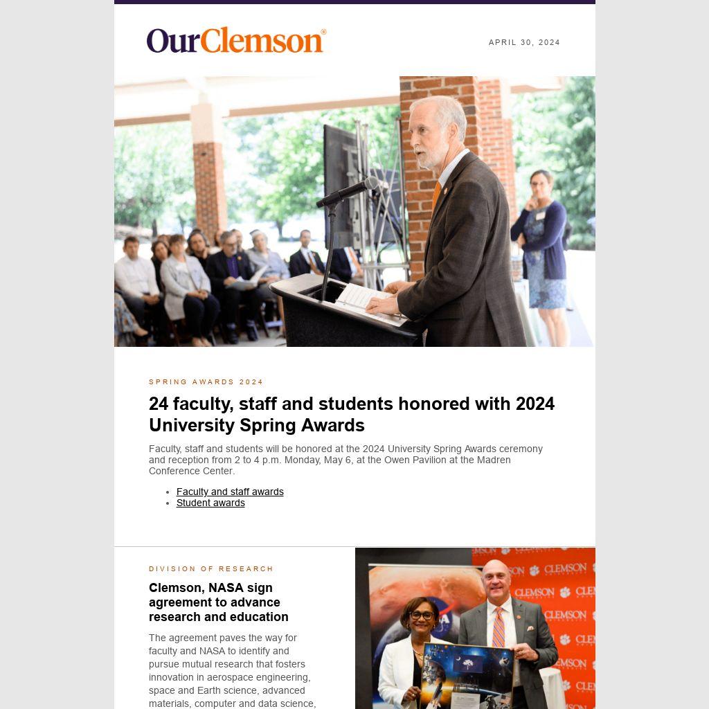 Congratulations to all University faculty and staff who achieved significant milestones in April, including Gregory Scott, Alex Kitaygorodskiy and Kimberly Arp, each celebrating 30 years at Clemson.