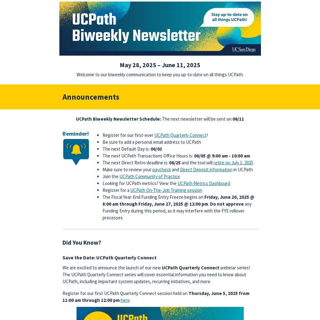 UCPath Biweekly Newsletter Schedule: The next newsletter will be sent on 06/11 |