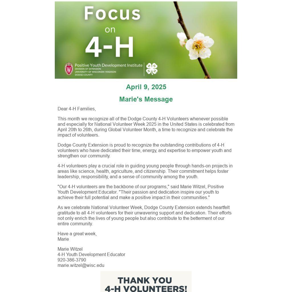 This month we recognize all of the Dodge County 4-H Volunteers whenever possible and especially for National Volunteer Week 2025 in the United States is celebrated from April 20th to 26th, during Global Volunteer Month, a time to recognize and celebrate the impact of volunteers.