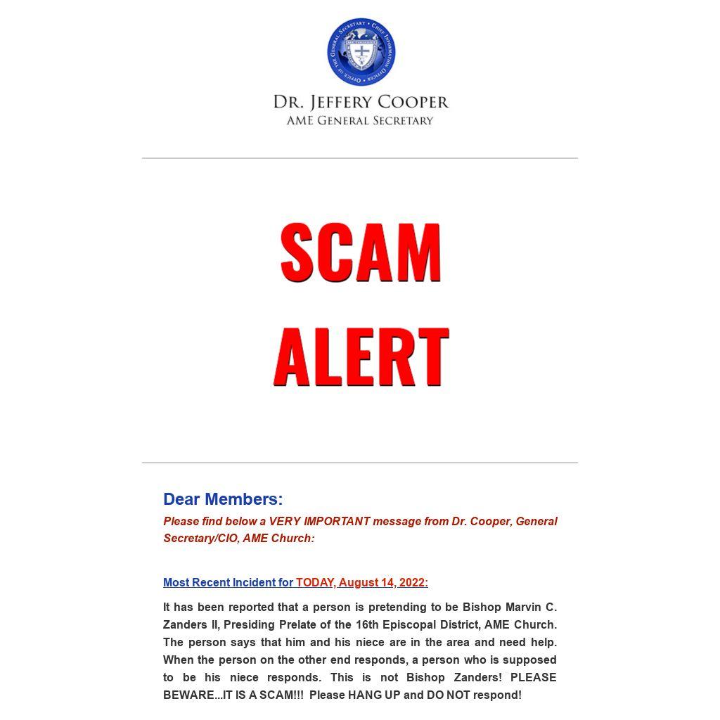 It has been reported that a person is pretending to be Bishop Marvin C. Zanders II, Presiding Prelate of the 16th Episcopal District, AME Church. The person says that him and his niece are in the area and need help. When the person on the other end responds, a person who is supposed to be his niece responds. This is not Bishop Zanders! PLEASE BEWARE...IT IS A SCAM!!! Please HANG UP and DO NOT respond!
