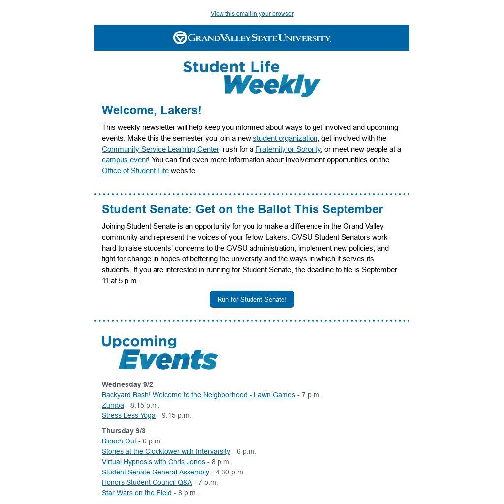 Joining Student Senate is an opportunity for you to make a difference in the Grand Valley community and represent the voices of your fellow Lakers. GVSU Student Senators work hard to raise students’ concerns to the GVSU administration, implement new policies, and fight for change in hopes of bettering the university and the ways in which it serves its students. If you are interested in running for Student Senate, the deadline to file is September 11 at 5 p.m.