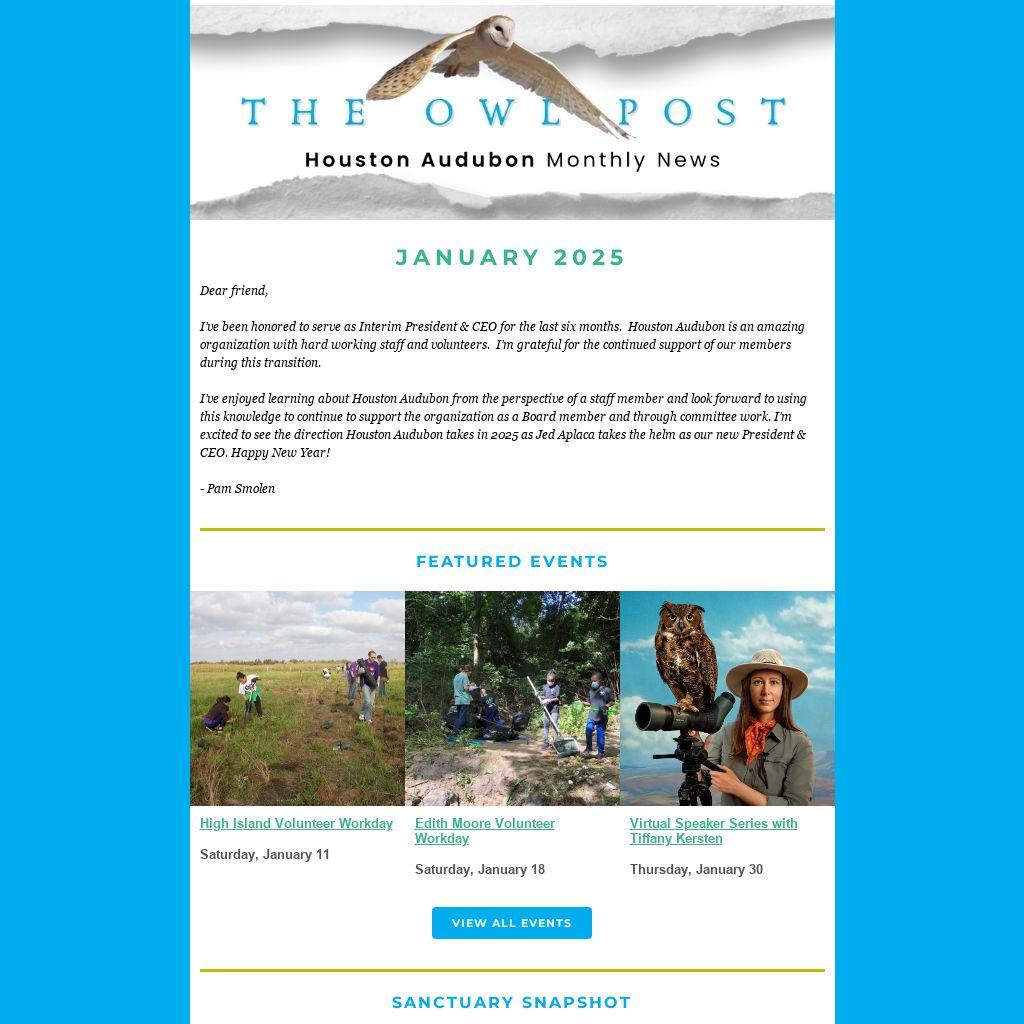 I’ve enjoyed learning about Houston Audubon from the perspective of a staff member and look forward to using this knowledge to continue to support the organization as a Board member and through committee work. I’m excited to see the direction Houston Audubon takes in 2025 as Jed Aplaca takes the helm as our new President & CEO. Happy New Year!