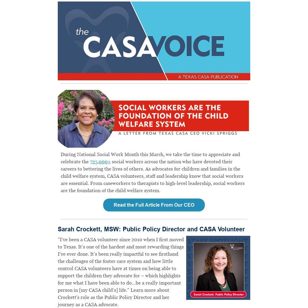 "I’ve been a CASA volunteer since 2010 when I first moved to Texas. It’s one of the hardest and most rewarding things I’ve ever done. It’s been really impactful to see firsthand the challenges of the foster care system and how little control CASA volunteers have at times on being able to support the children they advocate for – which highlights for me what I have been able to do…be a really important person in [my CASA child’s] life." Learn more about Crockett's role as the Public Policy Director and her journey as a CASA advocate.