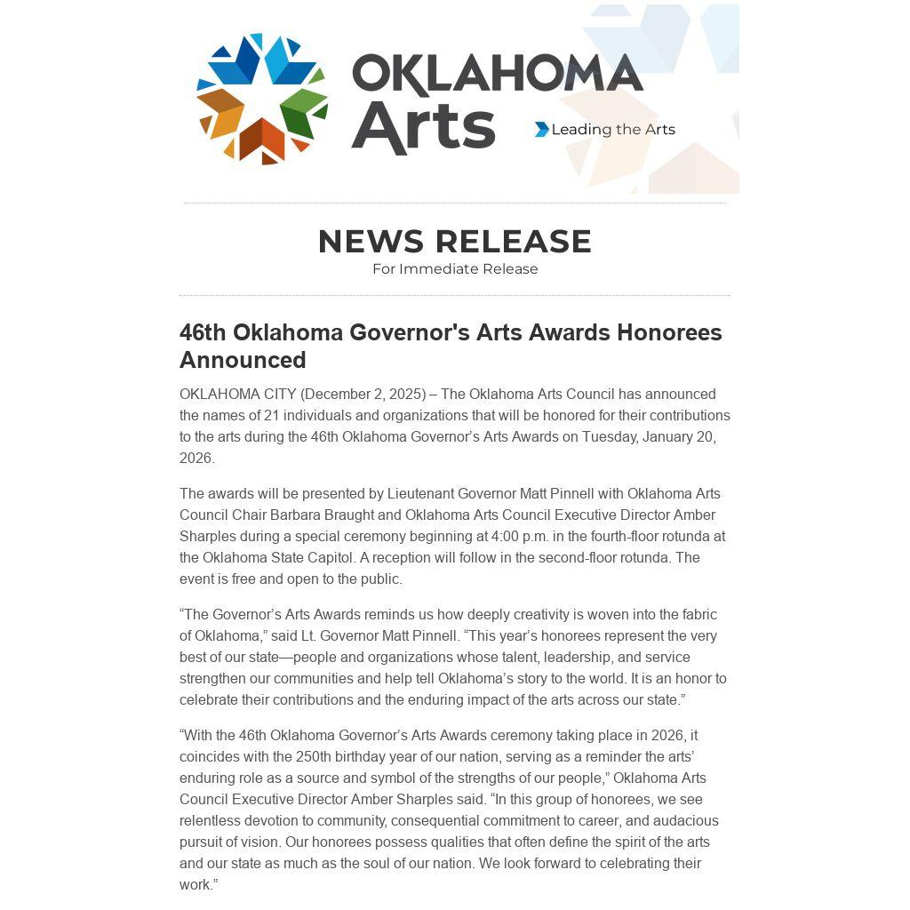 OKLAHOMA CITY (December 2, 2025) – The Oklahoma Arts Council has announced the names of 21 individuals and organizations that will be honored for their contributions to the arts during the 46th Oklahoma Governor’s Arts Awards on Tuesday, January 20, 2026.