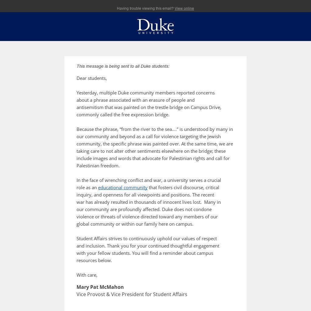 In the face of wrenching conflict and war, a university serves a crucial role as an educational community that fosters civil discourse, critical inquiry, and openness for all viewpoints and positions. The recent war has already resulted in thousands of innocent lives lost. Many in our community are profoundly affected. Duke does not condone violence or threats of violence directed toward any members of our global community or within our family here on campus.