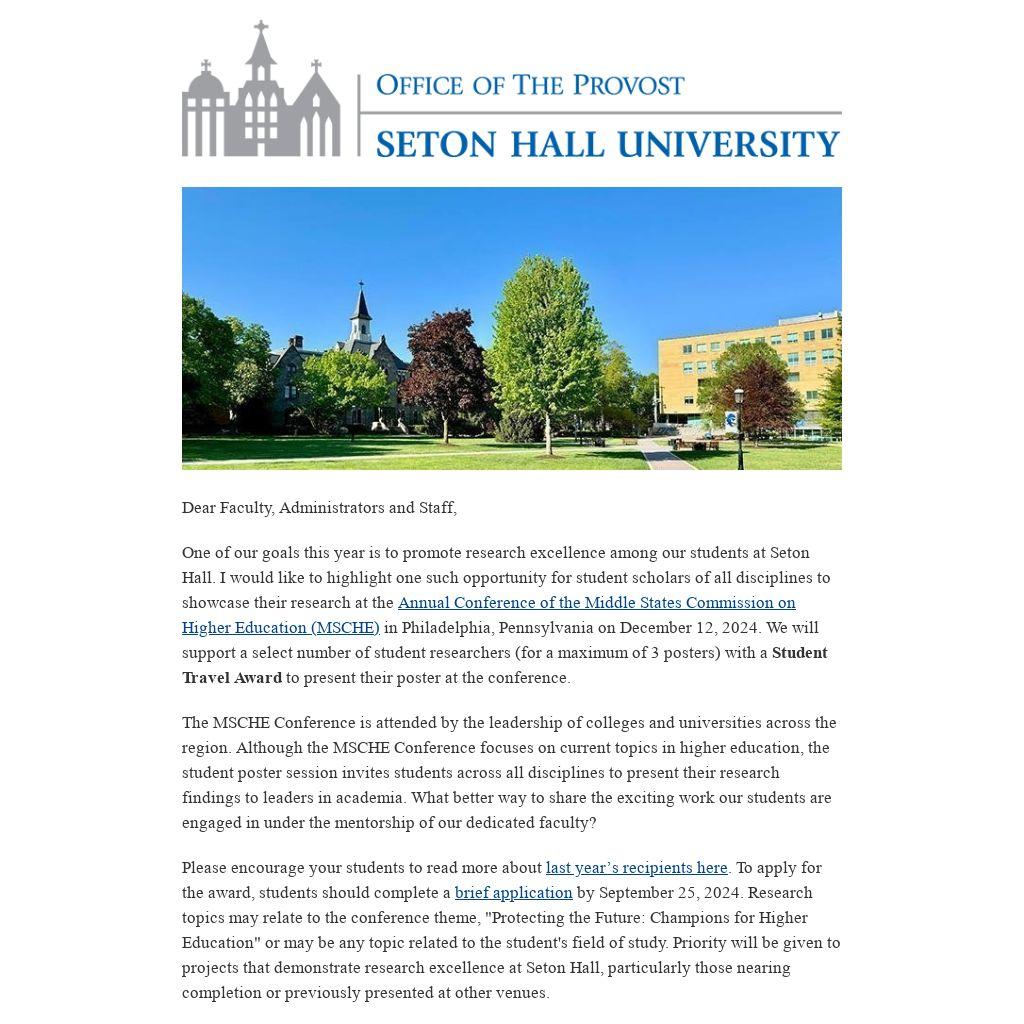 One of our goals this year is to promote research excellence among our students at Seton Hall. I would like to highlight one such opportunity for student scholars of all disciplines to showcase their research at the Annual Conference of the Middle States Commission on Higher Education (MSCHE) in Philadelphia, Pennsylvania on December 12, 2024. We will support a select number of student researchers (for a maximum of 3 posters) with a Student Travel Award to present their poster at the conference.