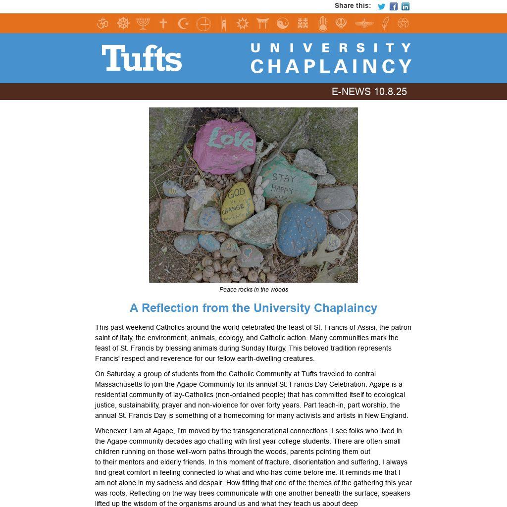 The University Chaplaincy is a dynamic hub supporting religious, spiritual, ethical, and cultural life for all members of the Tufts community. We provide spiritual care, support religious and philosophical communities, educate about spiritual and ethical issues in society and the world, and promote multifaith engagement.