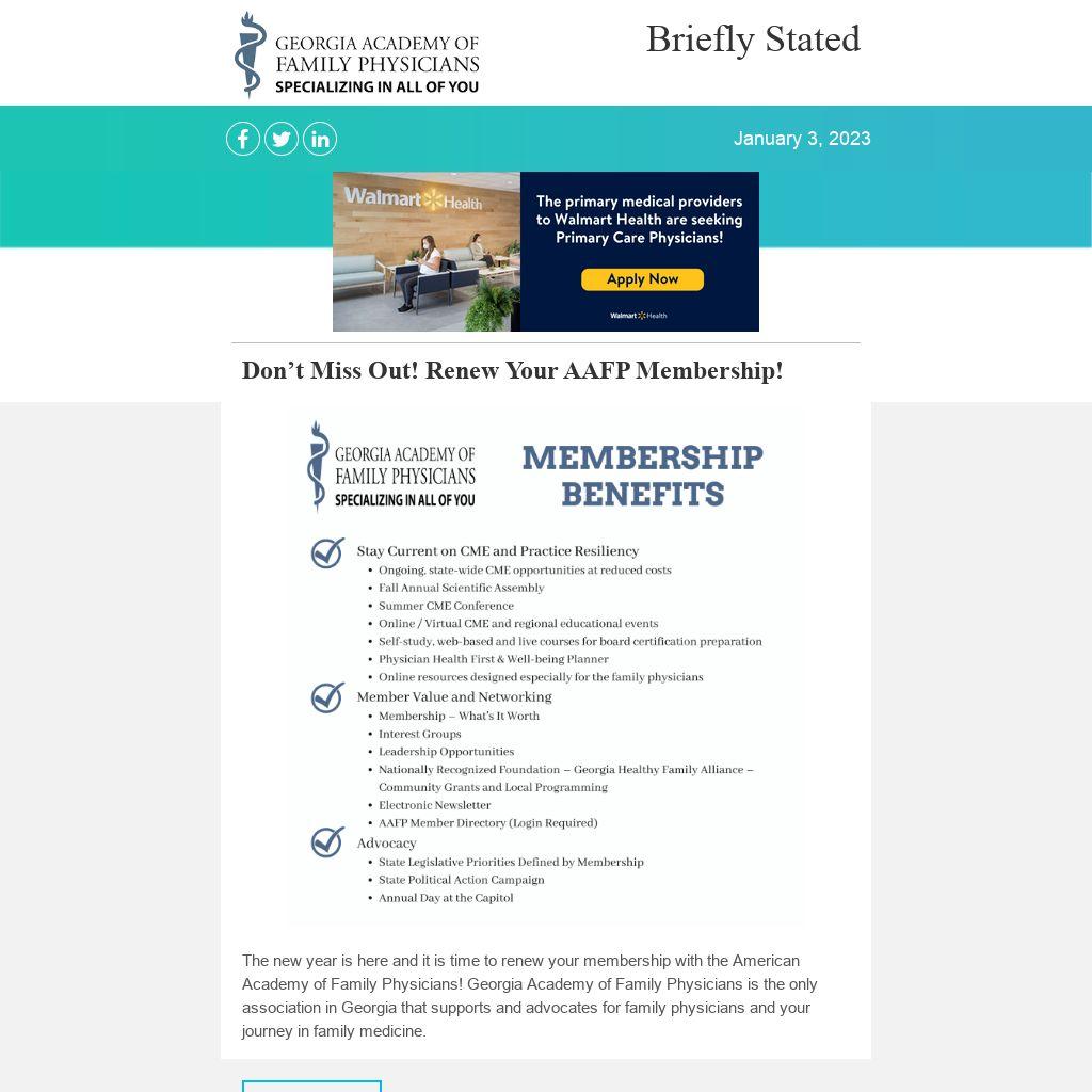 The new year is here and it is time to renew your membership with the American Academy of Family Physicians! Georgia Academy of Family Physicians is the only association in Georgia that supports and advocates for family physicians and your journey in family medicine.