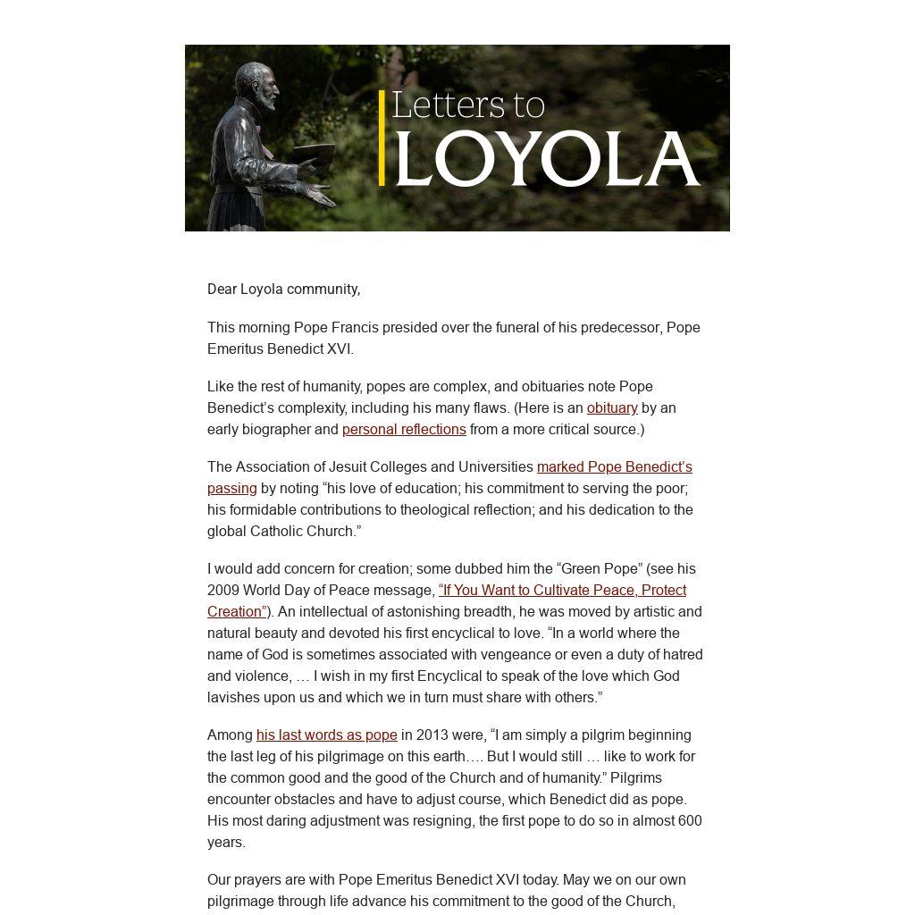 The Association of Jesuit Colleges and Universities marked Pope Benedict’s passing by noting “his love of education; his commitment to serving the poor; his formidable contributions to theological reflection; and his dedication to the global Catholic Church.”