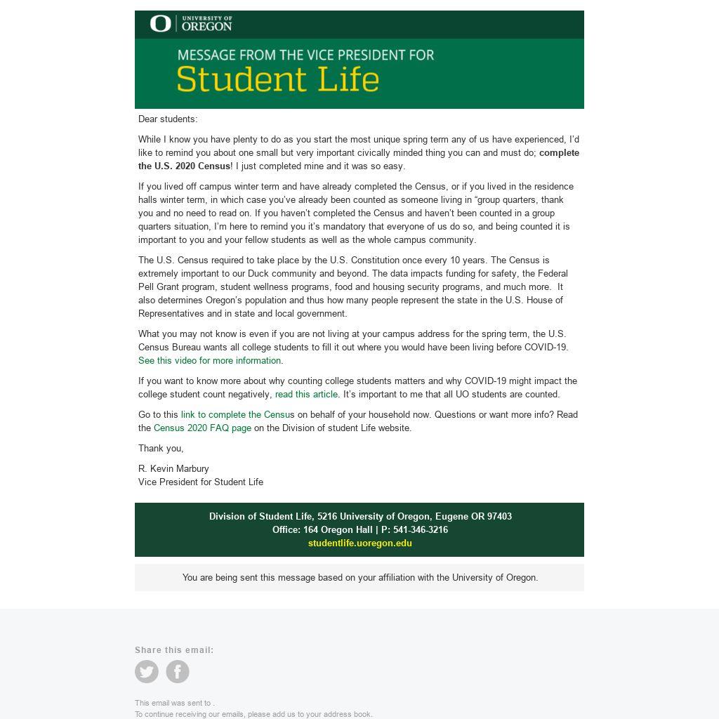 If you want to know more about why counting college students matters and why COVID-19 might impact the college student count negatively, read this article. It’s important to me that all UO students are counted.