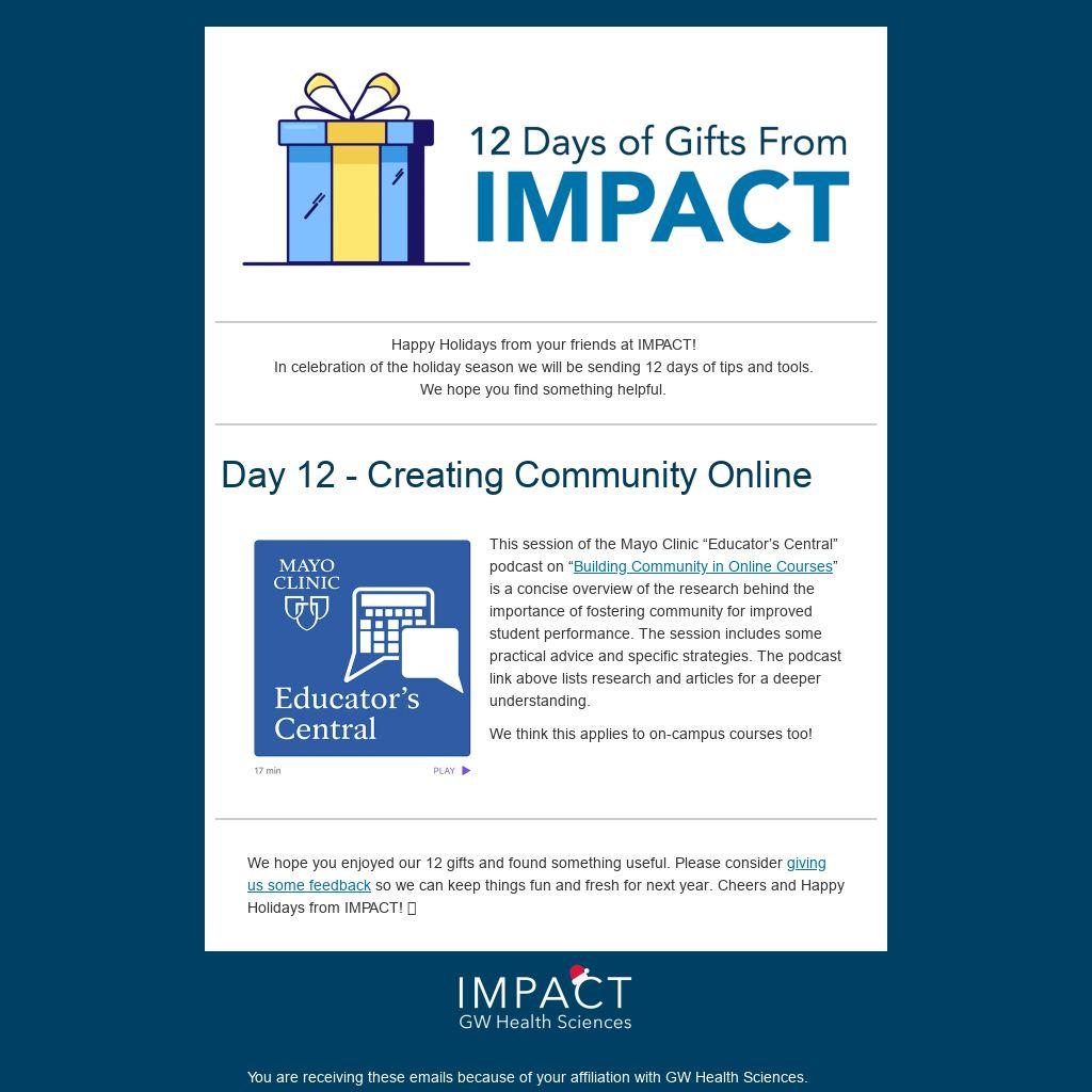 Happy Holidays from your friends at IMPACT! In celebration of the holiday season we will be sending 12 days of tips and tools. We hope you find something helpful.