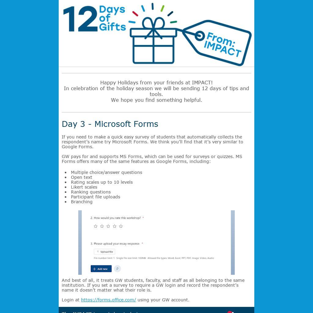 GW pays for and supports MS Forms, which can be used for surveys or quizzes. MS Forms offers many of the same features as Google Forms, including: