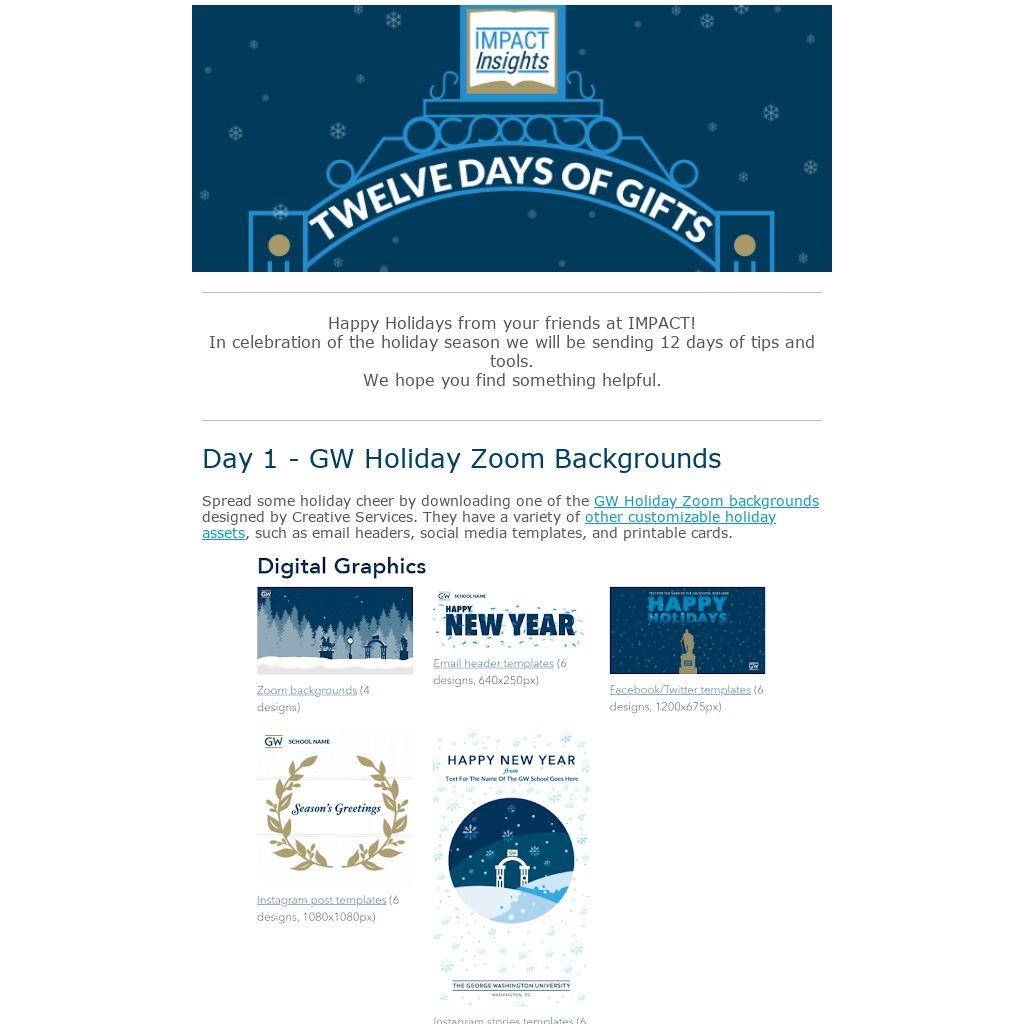 Spread some holiday cheer by downloading one of the GW Holiday Zoom backgrounds designed by Creative Services. They have a variety of other customizable holiday assets, such as email headers, social media templates, and printable cards.