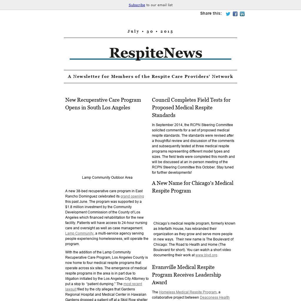 The mission of the Respite Care Providers’ Network (RCPN) is to improve the health status of individuals who are homeless by supporting programs that provide medical respite and related services. The RCPN Steering Committee works to achieve this mission.