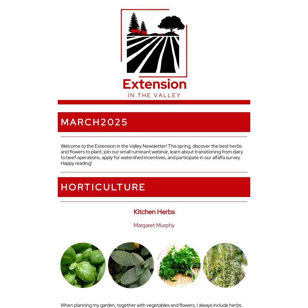 Welcome to the Extension in the Valley Newsletter! This spring, discover the best herbs and flowers to plant, join our small ruminant webinar, learn about transitioning from dairy to beef operations, apply for watershed incentives, and participate in our alfalfa survey. Happy reading!