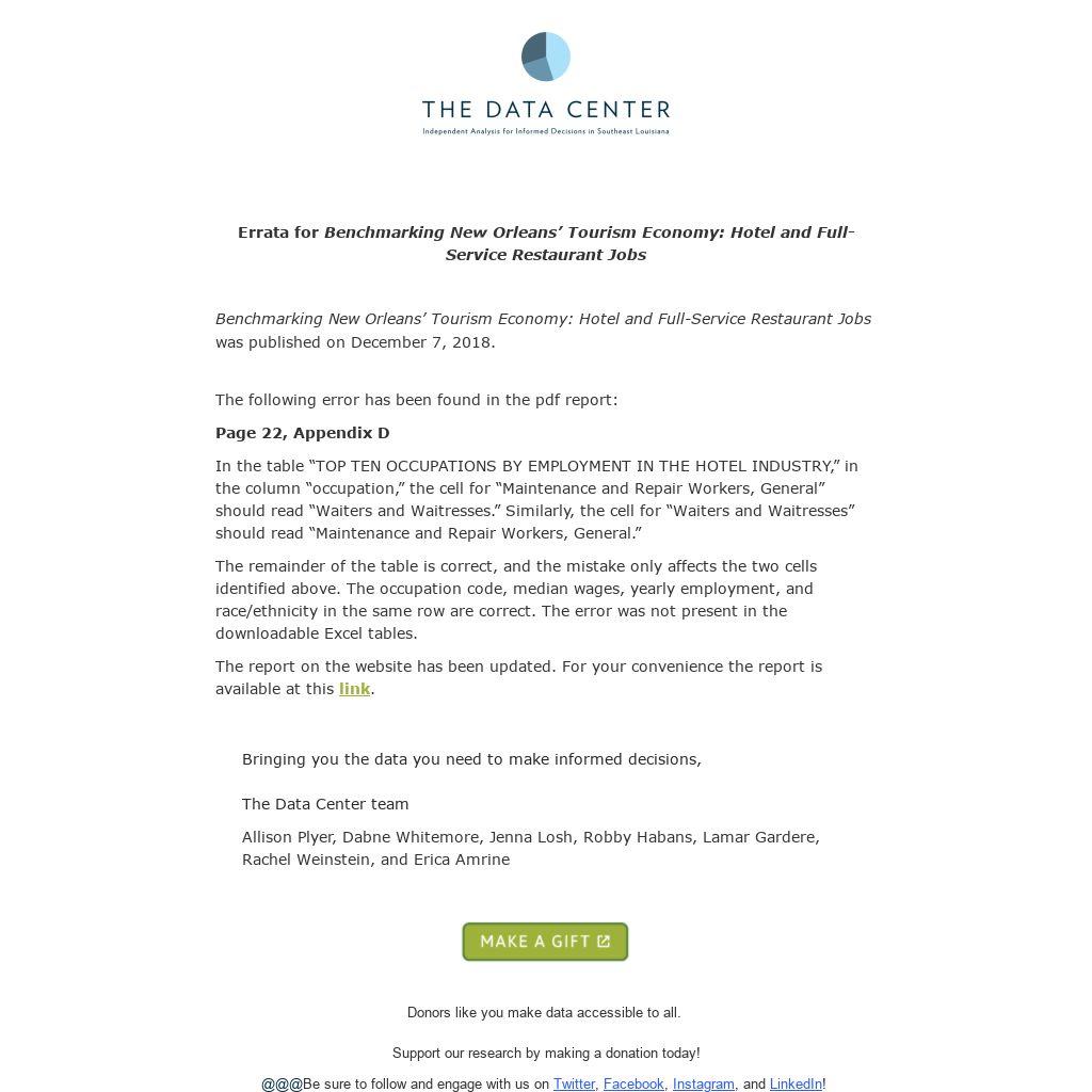 Errata for Benchmarking New Orleans’ Tourism Economy: Hotel and Full-Service Restaurant Jobs