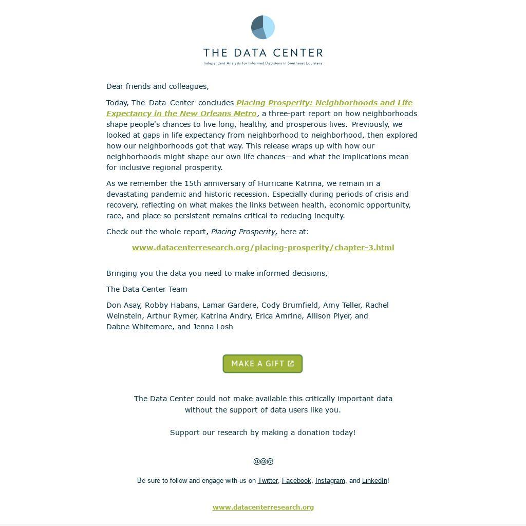 Today, The Data Center concludes Placing Prosperity: Neighborhoods and Life Expectancy in the New Orleans Metro, a three-part report on how neighborhoods shape people's chances to live long, healthy, and prosperous lives. Previously, we looked at gaps in life expectancy from neighborhood to neighborhood, then explored how our neighborhoods got that way. This release wraps up with how our neighborhoods might shape our own life chances—and what the implications mean for inclusive regional prosperity.