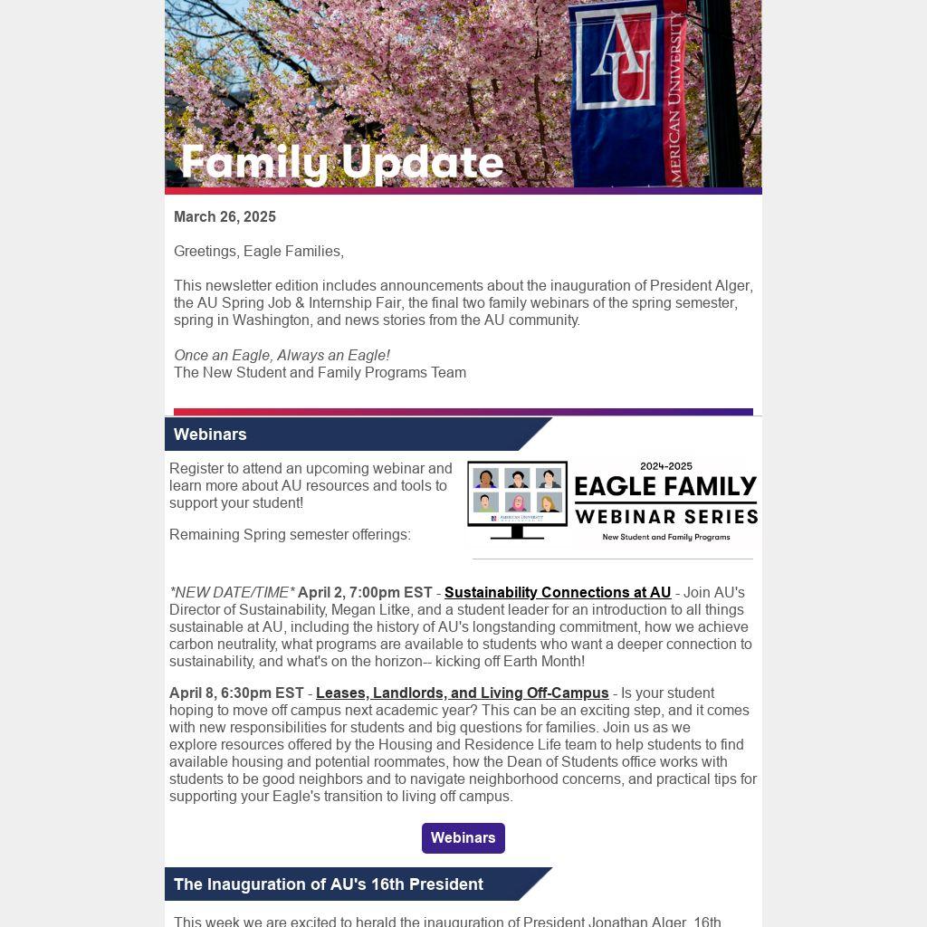 This newsletter edition includes announcements about the inauguration of President Alger, the AU Spring Job & Internship Fair, the final two family webinars of the spring semester, spring in Washington, and news stories from the AU community.