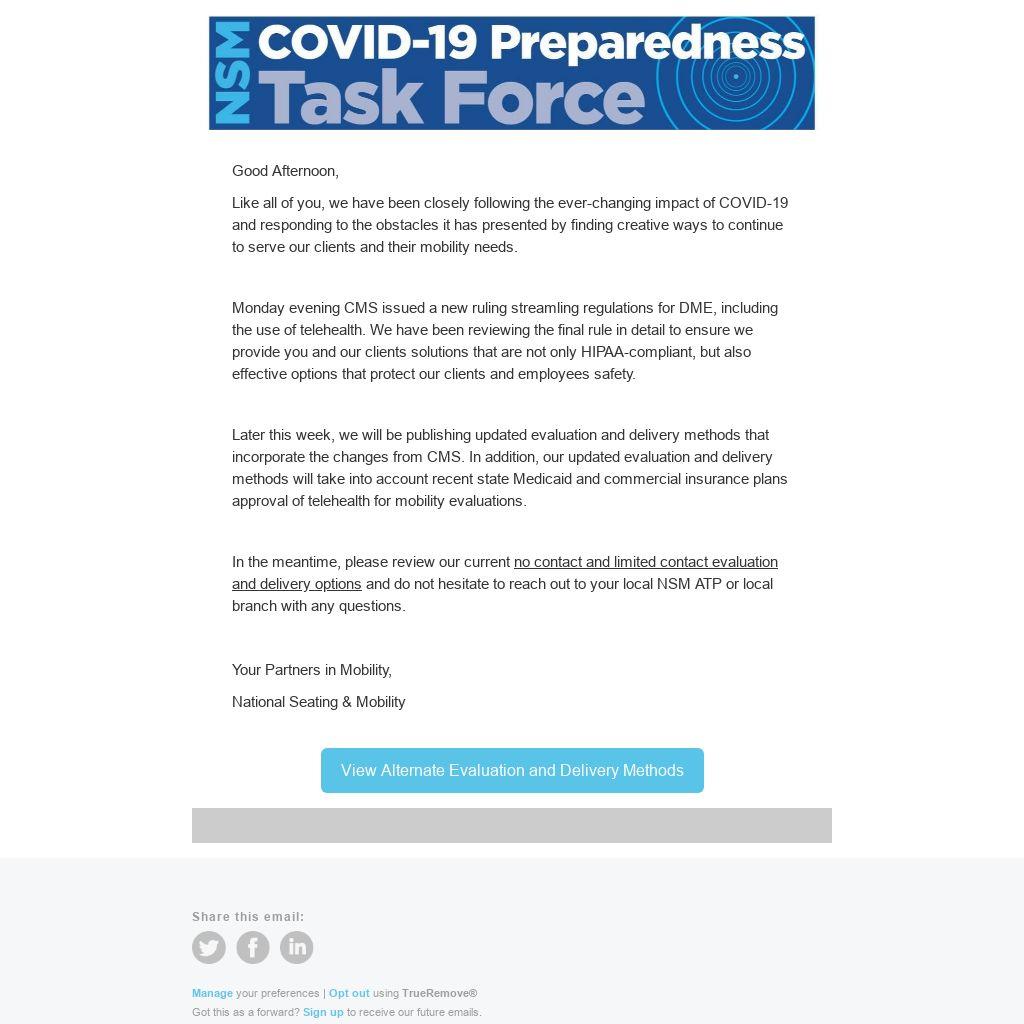 Later this week, we will be publishing updated evaluation and delivery methods that incorporate the changes from CMS. In addition, our updated evaluation and delivery methods will take into account recent state Medicaid and commercial insurance plans approval of telehealth for mobility evaluations.