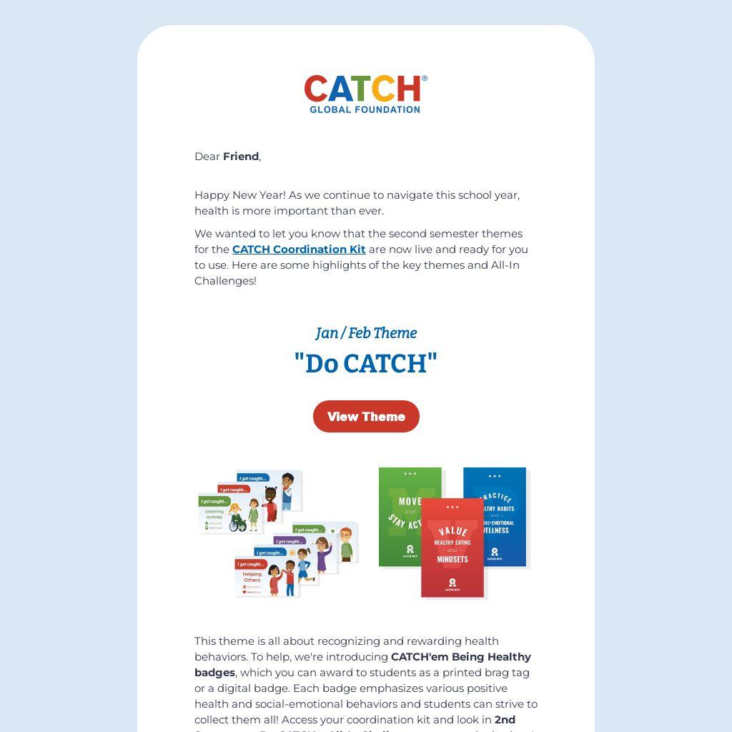 This theme is all about recognizing and rewarding health behaviors. To help, we're introducing CATCH'em Being Healthy badges, which you can award to students as a printed brag tag or a digital badge. Each badge emphasizes various positive health and social-emotional behaviors and students can strive to collect them all! Access your coordination kit and look in 2nd Semester > Do CATCH > All-In Challenge to access the badges!
