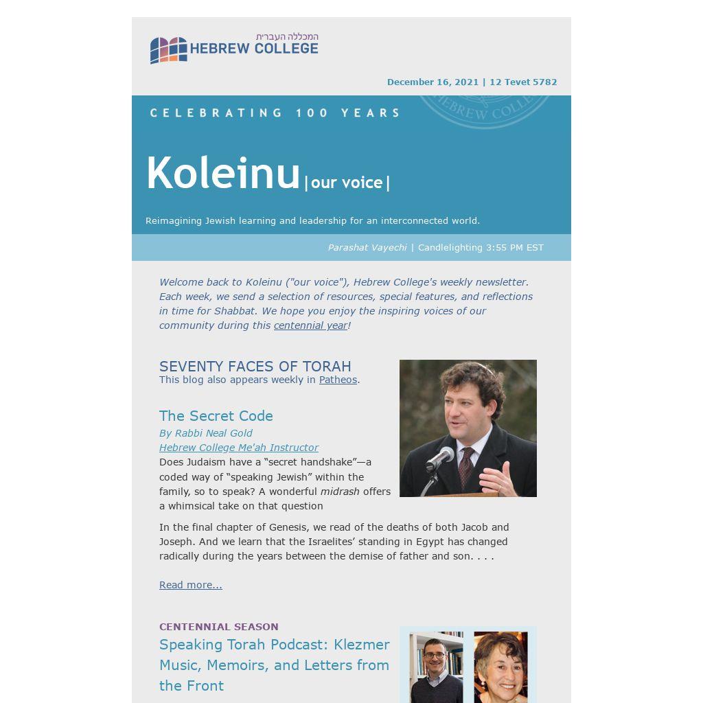 Welcome back to Koleinu ("our voice"), Hebrew College's weekly newsletter. Each week, we send a selection of resources, special features, and reflections in time for Shabbat. We hope you enjoy the inspiring voices of our community during this centennial year!