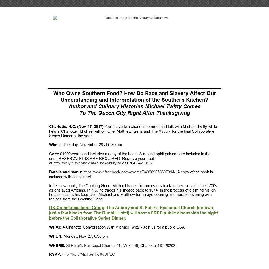 Charlotte, N.C. (Nov. 17, 2017) You'll have two chances to meet and talk with Michael Twitty while he's in Charlotte. Michael will join Chef Matthew Krenz and The Asbury for the final Collaborative Series Dinner of the year.